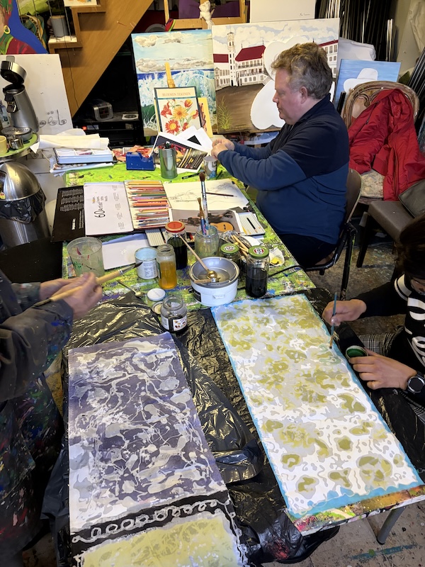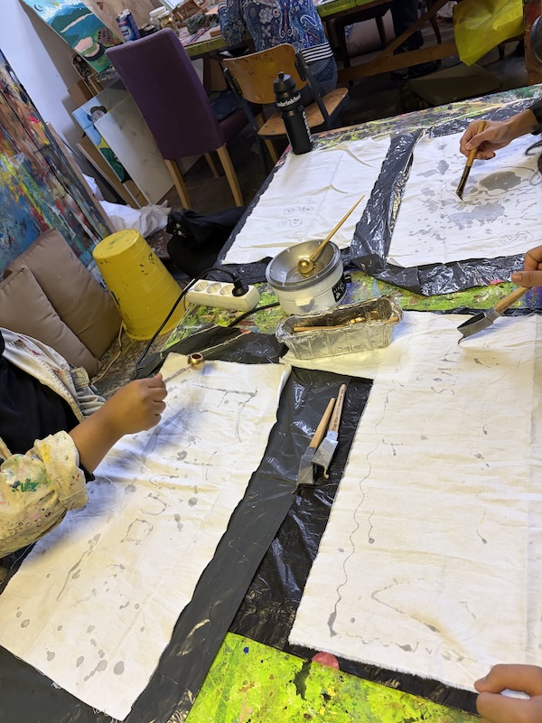 Allemaal samen batikken het gebeurt in kunstencentrum Transvaal de werkplaats van Topaze. Kunstencentrum Transvaal is een initiatief van Topaze en wordt mede ondersteund door de gemeente Den Haag.