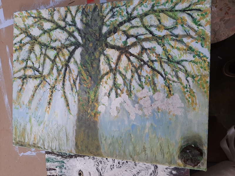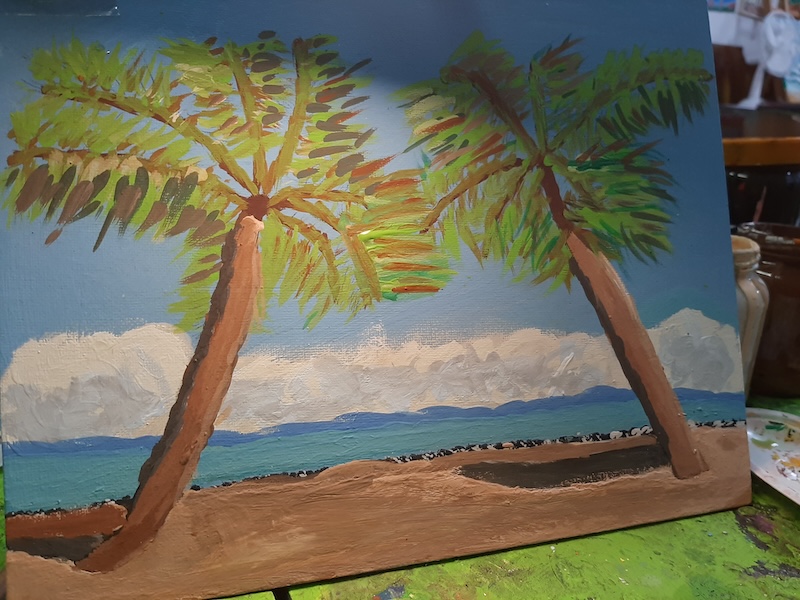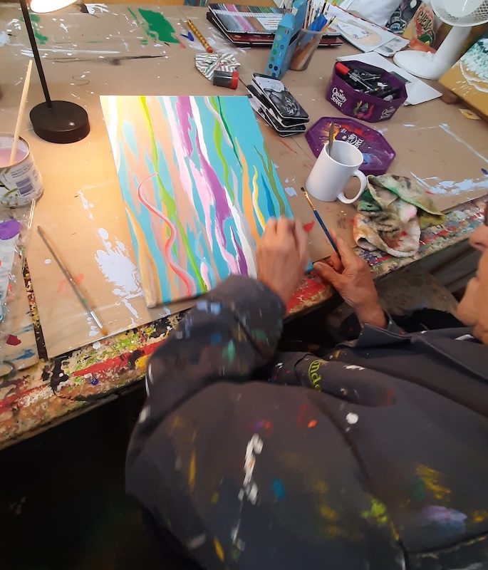 Wijkkunstenaars aan de slag bij Topaze, kleurrijk en tropisch en natuurlijk.